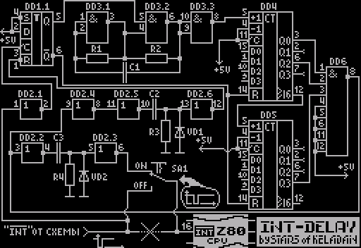 Месяц поисков оптимального решения вылил- ся в небольшую схемку, приведенную чуть ниже. Суть работы данного устройства заключает- ся в задержке запросов маскируемых преры- ваний, поступающих от схемы компьютера на вход INT микропроцессора на строго задан- ную величину. Величина временно'й задержки может быть отрегулирована. Схема включает- ся в разрыв между входом INT микропроцес- сора и остальной частью схемы компьютера.![]()