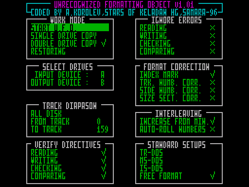 АНОНС Как вы наверное уже заметили. у нас еще одна новая рубрика. надеемся. постоянная. B ней мы будем рассказывать o работах ве- дущих программистов нашей Самары (естест- венно тех. кого мы знаем. кого не знаем - ау. отзовитесь. будем рады вас видеть).ко- торые находятся либо на стадии разработки. либо на стадии тестирования. т.е. потом "перекочуют" в рубрику "ОБЗОР". где и бу- дут рассмотрены более подробно. Так как от нескромности нам смерть не грозит, то начнем с себя. ZX-WINWORD. (гр."STARS OF KELADAN". E.Милун) ══════════════════════════════════════════ Как я и надеялся, название довольно обе- скураживающее: "ZX" - понятно, а вот "WIN- WORD" - ? Хотя умудренный опытом работы с IBM читатель уже нашел до боли родные зву- ки - "WINWORD" ("WORD FOR WINDOWS"). Вот об этом я сейчас и расскажу. Наверняка многие знают, чем "WORD FOR WINDOWS" (на IBM) очень даже выгодно отли- чается от "ЛЕКСИКОН"а (тоже на IBM) - воз- можностью включать в текст рисованные объекты (картинки, кружочки, эллипсы,...). На нашем SPECTRUM такого нет (по крайней мере в системе TR-DOS), и вот что обидно - на БК'шке подобный редактор ЕСТь ! Вот мы и решили сделать нечто наподобие маленькой издательской системы на SPECTRUM.Если вы сейчас читаете эти строки, то значит первая версия уже готова - она разрабатывалась для удобства в оформлении нашего журнала и содержит минимальный на- бор функций (пока). Одним словом, "ZX-WIN- WORD" по нашему замыслу должен стать ана- логом IBM'овского "WORD FOR WINDOWS". Пользовательский интерфейс и меню я сде- лал по типу очень понравившегося мне реда- ктора "ZX/IBM EDITOR", за что прошу не су- дить меня строго - в каком-то смысле это продолжение "ZX" - он может работать с ним в одном пакете. Единственное нехорошее от- личие - "ZX-WINWORD" рассчитан на работу с памятью 128К, это связано с объемами текс- та-графики,которые он может обрабатывать. Теперь о названии. Почему "WIN-", ведь "WINDOWS" там и не пахнет ? А что мне при- кажете делать ? Ведь WORD на SPECTRUM уже есть, неважно, что это скорее "ЛЕКСИКОН", чем "WORD", но ведь название уже "занято". Вот и пришлось давать такое название. UNRECOGNIZED FORMATTING OBJECT v1.0. (гр. "STARS OF KELADAN". A.Королев) ══════════════════════════════════════════ Еще один копировщик диск-в-диск с однов- ременным форматированием выходного диска. Нет, это не просто "еще один". Это, по на- шим прикидкам один из самых лучших и уни- версальных. Судите сами о возможных режи- мах его работы:копирование (с форматирова- нием, естественно) на двух дисководах, на одном, "лечение" дисков (подрежим копиро- вания на одном дисководе). Причем все это при довольно большой скорости работы с од- ним диском - около 4-х минут для одного MS-DOS диска. (Согласитесь, это очень быс- тро, учитывая тот факт, что разметка на копируемом диске может быть случайной, например, как в UFO-2 или ZX-FORMAT#3). В общем-то, "забегая назад", этот копиров- щик задумывался для копирования игры "UFO TERROR IN DEEP",но в последствии был тран- сформирован под "извратные" дискеты.![]()