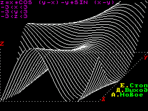 В "UN.FOR.OBJ" есть масса настроек,с по- мощью которых вы можете управлять процес- сом копирования, например выключить прове- рки достоверности чтения/записи дискет. Есть даже совершенно уникальная настройка- позволяющая сравнивать содержимое входно- го и выходного диска при копировании, что позволяет повысить достоверность копирова- ния. [По нашим данным, именно из-за "глю- ков" при копировании трек-в-трек разными навороченными копирами без сравнения копии и оригинала в Самаре ходят запоротые UFO2 и ZX-FORMAT#4.] C помощью "U.F.O." вы можете сделать ко- пию диска, например TR-DOS,MS-DOS, IS-DOS. Про IS-DOS стоит поговорить особо. Дело в том, что этот копировщик не просто копи- рует IS-DOS диски, но делает их "MASTER DISK"ами, т.е. IS-DOS-доктора "признают" копии как MASTER-диски. Единственное, что "не по зубам" копиров- шику - это всяческие изощренные дисковые защиты, которые анализируют образ трека. Но,возможно в скором времени этот недос- таток будет исправлен. Учитывая особую изощренность работы про- граммы,U.F.O не может работать в столь по- пулярных у нас "виртуальных" SPECTRUMax, то бишь эмуляторах. Программа, будучи за- пущена в оном, выведет веселую надпись типа "WORKING UNDER Z-80 EMULATOR" и ра- ботать она будет чисто условно - можно "полазить" по менюшкам, но запустить копи- рование будет нельзя. ДИЗАЙНЕР АНАЛИЗА ФУНКЦИЙ (DAF) v8.4 ORIGINAL IDEA AND DESIGN : EDA SOFT CORRECTED AND REMIXED BY : M.M.A/SC ════════════════════════════════════ Со времени разработки первой версии DAF'а прошло около года,а уже более 10 различных версий программы ходит по стране. Сегодня я (M.M.A) представляю вам новую версию под рабочим номером 8.4 . Это несколько не то, что было мною обещано, но все же! Итак, что есть такое - DAF ? А DAF,отвечу я вам, это такая ценная прог- рамма,которая может внезапно облегчить или затруднить вам жизнь! Ну а если серьезно , то с помощью DAF'а вы можете строить графики функций и их произ- водных разного порядка,исследовать поведе- ние функции (вогнутость,выпуклость и т.д.) а так же многое-многое другое,о чем вы да- же помыслить себе не могли. Изначально DAF задумывался как программа, помогающая в процессе обучения в школе или на первом-втором курсе института. Но затем была замечена возможность использования этой замечательной программы в demo строе- нии в качестве расчетчика сложных траекто- рий движения (спрайтов на экране). Но для использования этой потенциальной возможно- сти программу нужно было дополнить проце- дурами загрузки-выгрузки буфера координат и многим-многом другим. Естественно, все это могло работать только из 128KB. Как предполагалось,все это должно быть ре- ализовано в версии 8.5,но по причине за- держки выпуска данной версии , я решил не ждать,а уже сейчас выпустить последнюю для пользователей 48KB машин версию DAF 8.4 Вот краткий перечень изменений в программе - повышена точность вычислений значений функций и производных на один знак после запятой. - в режиме построения введена бегущая строка в которой описываются все фун- кциональные клавиши. - реализован метод решения нелинейных уравнений (метод НьЮТОНА-РАФCОНА) в результате чего можно по известному значению "Y" найти соответствующее значение "X". - исправлена масса мелких ошибок и опе- чаток в текстах.
