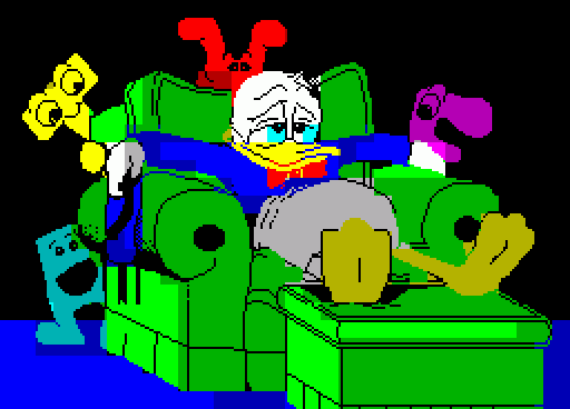 Однако пора вспомнитьSPECCY - еще одно дока- зательство былой популярности нашего ZX). Полагаем, что о пер- сонаже многих мультфильмов Уолта Диснея рассказывать не надо. И как-то раз случилась со знамени- тым утенком странная история. ...Дональд живет в большом до- ме, где есть гостиная, спальня, кухня, подвал, гараж и т.д. Си- дел он в один прекрасный вечер (а может, и не прекрасный,- ему лучше знать) на своем любимом диване, смотрел телевизор. Вдруг изображение сначала за- мерцало, а потом и пропало во- все. Послышались какие-то стран- ные звуки; было такое ощущение, как будто в соседней комнате бе- гают маленькие зверьки. Вспыльчивый нрав Дональда из- вестен многим. Вот и сейчас в большом гневе утенок решительно направился к выходу из гостиной. Но не успел он сделать и не- скольких шагов, как сзади тоже подозрительно зашумело. Обернув- шись, Дональд увидел, как из-за мебели показались какие-то непо- нятные существа. Они бегали и прыгали, издавая при этом скри- пучие звуки. Когда Дональд при- смотрелся к одному из этих су- ществ, оно напомнило ему латин- скую букву "C"... Вот так и начинается DONALD'S ALPHABEt CHASE. Дональду надо ходить из помещения в помещение, отлавливая непрошеных алфавитных "гостей". Делается это просто: как только какая-либо буква (из указанных на полосе над игровым полем) начинает мерцать, надо тут же нажать соответствующую клавишу. Утенок, поймав букву, бросает ее вверх, и она стано- вится "охотничьим трофеем". так будет продолжаться до тех пор, пока не будет "пойман" весь ал- фавит. Если же Дональд "промахивает- ся", он начинает очень сердить- ся; детям, конечно, не следует подражать такому Дональду. A что будет в конце "охоты"? Выяснить это нетрудно - в английском ал- фавите всего 26 букв.про "Дональда". Фирма-