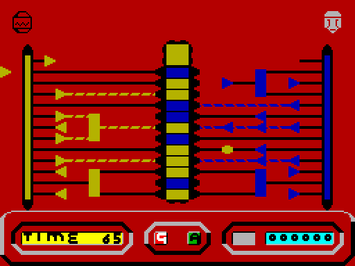 Цель этой логической подигры - окрасить максимальное количество прямоугольников в свой цвет. Сначала у вас имеется три кап- сулы, в дальнейшем их число может увеличи- ваться в зависимости от вашего SECURITY CLASS. Вы можете подсоединить свою капсулу к любому из проводов, соединённых с центральным блоком. На проводах могут сто- ять различные элементы: