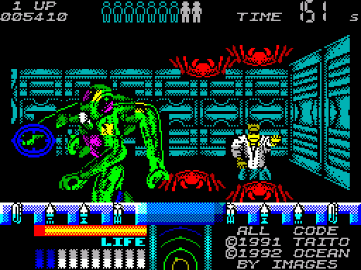 M.M.A/SPEED CO.'97Сегодняшний обзор я хочу начать с подборки чисто 128 килобайтовых игрушек. И SPACE GUN не зря занимает эти пресловутые кило- байты! Давно я не видел настолько ка- чественной стрелялки. Фактически,предста- вить себе эту игру можно скрестив ALIENS с OPERATION WOLF/THUNDERBOLT/HANOI.К тому же на неподготовленного игрока может повеять DOOM'овидностью, что еще более усиливает впечатление от игры, хотя на самом деле DOOM'овидной она не является. Итак,ваша задача справиться с толпой иноп- ланетных существ,захвативших несколько об- ъектов с людьми в далеком космосе. Ес- тественно,вашей целью является освобожде- ние как самих объектов,так и людей захва- ченных в заложники. Так как подобный контакт с пришельцами происходит впервые, никто не знает более или менее эффективных способов уничтожения пришельцев. Вы стреляете в этих гадов из какого-то страшного оружия, но для особо главных монстров припасены специальные ви- ды оружия : ракеты,криогенератор и т.д. Но в разгар боя не забывайте о заложни- ках, которые время от времени выбегают к вам, ища помощи и защиты. И в тоже время стоит быть предельно осторожным,так как на высших уровнях монстры могут маскироваться под людей, а потом внезапно нападать. В целом игра очень интересна. Прафика просто потрясает! Причём графика не чёр- но-белая, а крупная цветная! Подобную гра- фику мне приходилось видеть лишь в игре ASTRO MARINE CORP. Но в SPACE GUN,благода- ря использованию двух-экранной буферизации удалось достигнуть полного отсутствия кле- шинга атрибутов и при этом действие про- исходит в окне,большем чем две трети экра- на. Но самая интересная особенность SPACE GUN это возможность игры вдвоём одновременно.SPACE GUN