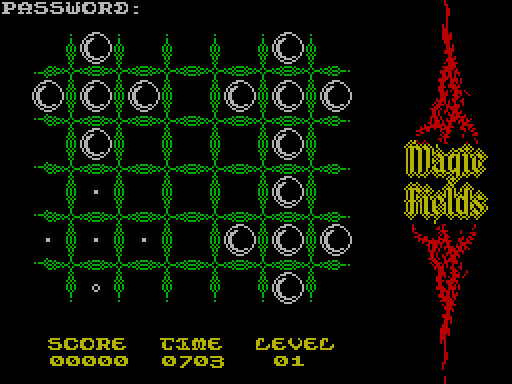 Как ни странно, но хотя игра сделана в 96-ом году, даже более того, в июне меся- це,это не российский программный продукт и даже не игра из ближнего зарубежья. MAGIC FIELDS это западная игра и игра абсолютно новая! Другое дело интересная ли она? Ну уж тут каждому своё... SPECTRUM'овская версия является конверсией с платформы AMIGA (RULEZ!), но и амижная версия в свою очередь была конверсией с C64. Так что истоки игры лежат на платфор- ме COMMODORE.Прочитав во вступлении о том, что идея игры взята с AMIGA, я сразу по- нял, _ЧТО_ же мне всё это напоминает. MAGIC FIELDS это логическая игра, и похожа она на TURN or XOR'EM ALL, которая прогре- мела год назад. Похожа с точностью наобо- рот. Если в TURN вы должны были собрать узор, то здесь ваша задача очистить игро- вое поле. Наведя курсор на нужную клетку и нажав огонь, вы получите на экране крест,состоя- щий из вертикальной и горизонтальной пря- мых, в каждой по пять шариков. Если в пре- делах этого креста нет шариков, то они по- явятся. Ну а если шары уже стоят то они естествено исчезнут. Принцип XOR - как он и есть! Игра логическая, а значит придётся порас- кинуть мозгами. Самое же главное, вы може- те открыть несколько полей подряд, побить авторский рекорд и проделать много других вещей, не боясь появления на экране оче- редного куска порнографии, "тянутой" с PC, в качестве приза.MAGIC FIELDS 48/128