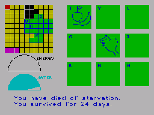 Учиться никогда не поздно!Как помнят самые свирепые поклонники SPECTRUM'а, титул лор- да присвоили Клайву Синклеру не за просто так, а за выдающиеся заслуги по компьюте- ризации учебного процесса. Сами понимаете, железо это одно, а обучающий soft это сов- сем другое. И если раньше обучающие программы,доходившие до нас,выглядели нес- колько убого и страшно, то этот шедевр,на- писанный в 1984 году, просто прекрасен! Из названия игры следует, что вам предсто- ит ни больше ни меньше,как ВЫЖИВАТь. А де- лать это можно в шкуре совы, вороб- ья, льва, полёвки, жука(майского) и бабоч- ки. Спектр животного мира достаточно широк и каждый сможет выбрать себе наиболее близкого персонажа. Далее вам предстоит просто питаться, и оставаться в живых - чем дольше, тем лучше... Игра очень проста в управлении и легко ос- ваивается. Чего не скажешь о брате- близнеце SURVIVAL'а, игре GLIDER. Эта программа написана теми же авторами, в том же стиле и позволяет почувствовать се- бя пилотом планера.SURVIVAL