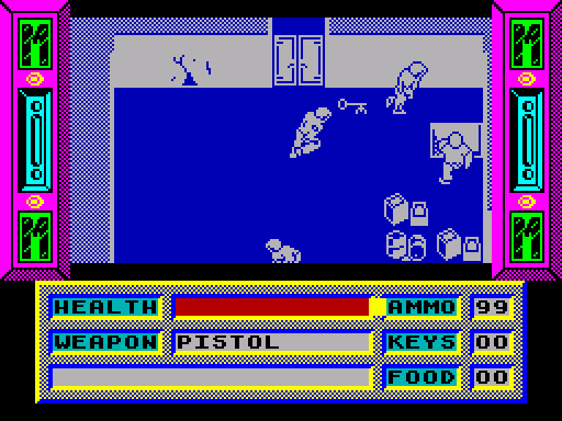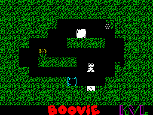 Эта игра несомненно понравится любителям напрягать мозги. Ну, а если вы ещё и фанат таких игр, как TUBE MIX, SLABE AGE или SOCOBAN, то BOOVIE - это именно то,что вам нужно! Вы управляете забавным мутантиком, который пытается обезвредить свои родные пещеры от радиоактивных контейнеров. И дело-то всё в том, что надо отправить контейнер в устройство по утилизации. А пещеры тоже не просто так - изгибаются,мешая толкать кон- тейнер. Вот тут-то и нужно то серое ве- щество, которое заключается (?) в Вашей черепной коробке. Игра написана в Словакии и, как в случае с KOMANDO 2, вам придётся поискать соот- ветствующий словацко-русский словарь. К тому же в программу встроен оригинальный обучатель ( держите "Н" во время загруз- ки) принципам игры, написанный опять же не на английском языке! Так что приходит время нам учить их язык, а им - наш. Стоит отметить, что игра состоит из сорока уровней, в каждый из которых можно попасть по паролю. Неплохая сопроцессорная музыка не даст вам уснуть. И всё это прекрасно работает даже из 48КВ!![]()