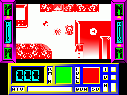 Пара очередей из АК-47 помогает охранникам понять всю бренность жизни. Ну а наш герой пристально вглядывается в даль - ключи, еда, вино, патроны, шины для ATV ! Но есть один такой склад (в нижнем правом углу), куда просто так не пускают,а требу- ют какой-то пропуск. "Вот где собака порылась", - подумал я, сбрасывая MOTOR MASSACRE. Игра всё же слишком двухцветная. Однако невыразительную графику с успехом компен- сируют обильные звуковые эффекты, но тут уж каждому своё.