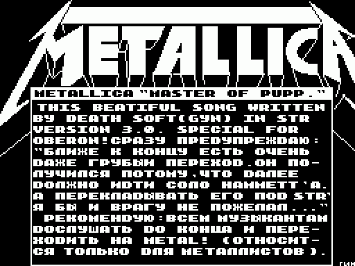 --====== Большой привет! =======-- Пишу для того,чтобы поделиться достижения- ми моего брата в супер адвентюре KAYLETH(by Stefan Ufnowski) Я не стану описывать подробно,как проходи- лась игра для того, чтобы в неё потом было интересно играть. Лишь дам несколько сове- тов для начинающих адвентюрщиков,которые посоветовал мне Кот. Для вас я приготовил словарь игры, который был выломан из самой программы Кот'ом и несколько советов. ----====== СЛОВАРь ИГРЫ =======---- N (NORTH) СЕВЕР S (SOUTH) ЮГ Е (EAST) ВОСТОК W (WEST) ЗАПАД SE (SOUTH-EAST) SW (SOUTH-WEST) NE (NORTH-EAST) NW (NORTH-WEST) U (UP) ВВЕРХ D (DOWN) ВНИЗ ENTER ВОЙТИ КУДА ЛИБО BOARD ! CLIMB ЗАЛЕЗТЬ КУДА ЛИБО HELP ПОНАДОБИТСЯ В КОНЦЕ SEARCH ОСМОТР ЛОКАЦИИ LEAVE ВЫЙТИ SIT СЕСТЬ USE ИСПОЛЬЗОВАТЬ GET ВЗЯТЬ ТАКЕ ВЗЯТЬ GRAB ВЗЯТЬ I (INVENTORY) ИНВЕНТАРЬ QUIT ВЫХОД ИЗ ИГРЫ DROP БРОСИТЬ ПРЕДМЕТ THROW БРОСИТЬ ПРЕДМЕТ ATTACK АТАКОВАТЬ KILL УБИТЬ SLAY УБИТЬ SMACH РАЗБИТЬ KICK УДАРИТЬ PUNCH ПРОБИТЬ LOOK ОСМОТРЕТЬ ЛОКАЦИЮ EXAM ИССЛЕДОВАТЬ ПРЕДМЕТ OPEN ОТКРЫТЬ UNFAST ОТКРЕПИТЬ UNLOCK ЗАКРЫТЬ CLOSE ЗАКРЫТЬ SHOOT ВЫСТРЕЛИТЬ READ ПРОЧИТАТЬ LOAD GAME ЗАГРУЗКА С ДИСКА LIE ЛЕЧЬ STAND ВСТАТЬ WAIT ЖДАТЬ AWAKE РАЗБУДИТЬ WAKE РАЗБУДИТЬ AROUSE РАЗБУДИТЬ ЕАТ √ ЕСТЬ DRINK √ ПИТЬ PULL ДЕРГАТЬ PUSH НАДАВИТЬ TUG НАДАВИТЬ PRESS НАЖАТЬ SWITCH ПЕРЕКЛЮЧИТЬ OPERATE √ INIT ИНИЦИАЛИЗИРОВАТЬ SAY СКАЗАТЬ SAVE GAME ЗАПИСЬ НА ДИСК ASK СПРОСИТЬ COMMAND СКОМАНДОВАТЬ TELL СКАЗАТЬ TALK РАЗГОВАРИВАТЬ QUEST СПРОСИТЬ FIT ПРИСОЕДИНИТЬ STICK ПРИСОЕДИНИТЬ INSERT ВСТАВИТЬ FIX ЗАКРЕПИТЬ PUT ПОЛОЖИТЬ PLACE РАЗМЕСТИТЬ BEND СОГНУТЬ FORCE √ BREAK СЛОМАТЬ TWIST ПОВЕРНУТЬ TURN ПОВЕРНУТЬ EMPTY ОПОРОЖНИTЬ POUR ! CUT ОТРЕЗАТЬ PICK ВЗЯТЬ FEEL √ TOUCH ДОТРОНУТЬСЯ WEAR ОДЕТЬ REMOWE СНЯТЬ OCED √ FIRE ВЫСТРЕЛИТЬ SHOOT ВЫСТРЕЛИТЬ BLAST ВЗОРВАТЬ UNDO √ UNSEAL ! FLIP ! Y (YES) ДА NO НЕТ PLANT ! GIVE ДАТЬ LIST √ STAR √ RIDE ! SWING √ SPIN ! WHIRE ! ROTATE ПОВЕРНУТЬ SWIM ПЛЫТЬ WADE √ PADD √ QSAVE ЗАПИСЬ НА RAM-DISK QLOAD ЧТЕНИЕ С RAM-DISK'A ВОМ BACK ONE MOVE AND И HIM ЕМУ ТНЕМ ИМ ALL ВСЕ EVER ВСЕ , РАЗДЕЛИТЕЛЬ √ - ЭТИМ СЛОВАМ ПРИМЕНЕНИЯ НЕ НАЙДЕНО, ХОТЯ ОНИ ЕСТь В ПРОГРАММЕ ! - ДЛЯ ЧЕГО НУЖНЫ ЭТИ СЛОВА, ВЫ ДОЙДЁТЕ САМИ, ЛИБО (В БОЛьШИНСТВЕ СЛУЧАЕВ) ИХ СООБЩИТ САМА ПРОГРАММА В ВИДЕ ЗАМАСКИРОВАННОЙ ПОДСКАЗКИ BACK ONE MOVE - очень удобная комманда. В переводе с english означает Назад На Один Ход. Ну, думаю вы и сами догадались о её применении... НА НЕКОТОРЫЕ ВВЕДЁННЫЕ КОМАНДЫ ПРОГРАММА РЕАГИРУЕТ ТАК: "Maybe later, maybe пот!", ЧТО ОЗНАЧАЕТ : "Возможно позднее,возможно никогда!" (про их примене- ние ) . -=-=-=-=-=-= Полезные советы! =-=-=-=-=-=- 1. Как начать игру вы прочитаете в Спектрофоне N.1 . 2. Почаще осаматривайте всё подряд, иногда нужные предметы лежат в самых неожидан- ных местах. 3. ВСЕ предметы, найденные в игре, рано или поздно вам пригодятся. Ещё раз пов- торяю: ВСЕ без исключения ! 4. В самой первой группе локаций вам попа- дётся любопытное кресло, на котором можно найти не менее любопытную knob . Попробуйте применить к ней turn, это позволит найти очень нужный предмет. 5. То, что запечатано (seal), всегда можно распечатать (unseal). 6. Лифтом пользоваться просто - нужно просто войти в него, либо, как говорят англичане, "взять лифт" . 7. Чтобы запустить AZAP CHAMBER, нужно на- печатать: "AZAP CODE ", и далее трёх- буквенный код, после чего нажать ENTER. 8. YAGMOOK очень добрый братан. Толкнёт вам хорошую речь с кучей советов, но на жутко непонятной тарабарщине. Дога- даться,как расшифровать этот текст, до- вольно трудно, поэтому даём подсказку: замените каждую букву текста на следую- щую по алфавиту. 9. YAGMOOK как-бы между прочим в своей ре- чи упомянет слово key. Рекомендую, расспросите его о нём подробнее. A. Определённую трудность представляет со- бой Mokky Ray. Н