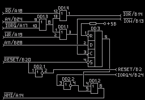 Подключение внутренних Hayes-совмести- мых модемов к Спектруму. ------------------------------------------ Для начала хочу сказать пару слов по по- воду всего нижеследующего. В принципе, эта схема уже не раз публиковалась, но... Но ведь не у каждого есть Питерская электрон- ная газета ZX-News, в 15-м номере которой была аналогичная статья. И уж тем более не каждый имеет доступ к эхоконференции ZX.SPECTRUM в сети Фидонет. А потому, мы взяли на себя смелость донести до вас этот материал, дорогие читатели. Тем более, что здесь же мы расскажем о тех тонкостях подключения, с которыми сами столкнулись. COPYRIGHT на схему контроллера принадле- жит Михаилу Кондратьеву. Автор статьи, под впечатлением от которой написана эта - Игорь Груздев. В первых же строках хочу ещё раз развеять миф о том, что нормально hayes-совместимый модем можно подключить только к Скорпиону. Ничего подобного! Просто на системном разъёме Скорпиона уже выведены все необхо- димые сигналы, а вот владельцам, например, Пентагонов придётся самим их протянуть. Причём, ещё неизвестно кому повезло боль- ше, владельцам Скорпиона или Пентагона - "пентагонщикам" не надо собирать схему, блокирующую внутренние порты компьютера. Да и согласование внутреннего и внешнего сигналов /NMI в Скорпионе выполнено немно- го неудачно (по крайней мере, для этой схемы подключения). Итак, меньше слов, ближе к делу. Для реализации контроллера внутреннего (!!!) HAYES-совместимого модема вам понадобятся три микросхемы и 8-10 резисторов. Микрос- хемы: DD1 - ЛЛ1, DD2 - ЛН1, DDЗ - ТМ2. Се- рия любая, хоть 1533-я, хоть 555-я, прин- ципиального значения это не имеет. Резис- торы любого номинала в интервале от 1 до 15 кОм.Как видите, схема довольно проста. C ле- вой стороны приведены названия сигналов и номера контактов (A - верхний ряд, В - нижний) для Скорпиона, с правой - Hayes- совместимого модема. На 1-й вход триггера (DDЗ) через резистор 1 КОм следует подать +5В для более надёжной работы схемы. Для запитывания микросхем на их 14- й вывод необходимо подать +5В, а на 7-й - землю. Как видно из схемы, контроллер произво- дит дешифрацию всего лишь по одному адрес- ному сигналу - A4, а между тем, полный его адрес - #xEF. Поэтому, если у вас Скор- пион или любой другой компьютер, у которо- го при дешифрации внутренних портов не анализируется сигнал A4, то вам надо ещё собрать и схемку формирования сигнала /IORQGE, котурую вы можете найти в этом же номере, в статье о подключении C-DOS моде- ма. Входными сигналами для этой схемы бу- дут: /IORQ и A4, выходным - /IORQGE. Теперь о том, как будет выглядеть рас- пайка слота модема и системного разъёма комьютера (номера контактов даны для Скор- пиона: A - верх, В - низ: на модеме: верх - верхняя часть платы, где расположены все микросхемы, нумерация контактов слота начинается со стороны разъёма для телефон- ной линии и дальше вдоль модема): Скорпион Модем ┌------┬---┐ ┌---┬------┐ │A 8 │A26│----> │A31│ A 0 │ │A 9 │В27│----> │A30│ A 1 │ │A10 │A27│----> │A29│ A 2 │ │D 0 │A6 │----> │A9 │ D 0 │ │D 1 │A7 │----> │A8 │ D 1 │ │D 2 │A8 │----> │A7 │ D 2 │ │D 3 │A11│----> │A6 │ D 3 │ │D 4 │A12│----> │A5 │ D 4 │ │D 5 │A10│----> │A4 │ D 5 │ │D 6 │A9 │----> │A3 │ D 6 │ │D 7 │A3 │----> │A2 │ D 7 │ │ │ │ │A28│ A 3 │ -┐ │ │ │ │A27│ A 4 │ │ на │ │ │ │A26│ A 5 │ │ +5В │ │ │ │A25│ A 6 │ │через │ │ │ │A24│ A 7 │ │3-10К │ │ │ │A23│ A 8 │ │ │ │ │ │A22│ A 9 │ -┘ │ │ │ │A21│ A10 │ -┐ на │ │ │ │A20│ A11 │ -┘ землю │ │ │ │A11│ AEN │ на землю │ +5v │В3 │----> │В3 │ +5v │ -->│ +12v │В17│----> │В9 │ +12v │ -->│ -12v │A16│----> │