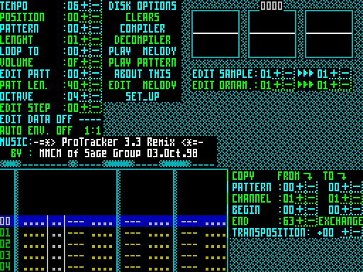 ┌----------- PROTRACKER v3.31r ----------┐ │ (C) GOLDEN DISK CORPORATION 29.sep.97 │ │ REMIX by ММСМ of SAGE GROUP sep.98 │ └----------------------------------------┘ Hi MUSIC MAKERS! Зто как ни странно я. MMCM Я предлагаю вам свой небольшой REMIX PROTRACKER'A версии 3.31, походу послед- ней, так как я звонил NICK'у в Воронеж, узнать, будут ли следущие версии этого на- вороченого редактора музыки ???! И он ска- зал мне, что навряд-ли! - так как у него нет сейчас времени и SPECCY. чтобы что-то делать. Что же, будем довольствоваться этой версией, раз других не намечается ... Итак, что же я изменил ? (Надеюсь, в лучшую сторону).l. Переставил по своему усмотрению функции меню. 2. Перекрасил его малость (думаю, вам пон- равится). 3. Убрал запрос SEARCH COMPILE SONG. 4. Перерисовал шрифт,стрелку и сам вид РТ. S. Убил следующий глюк: если PT3 загрузить из CONSUL COMANDER'а и в DISK OPTIONS сделать установку DRIVE A клавишей [1] то дисковод начинает заниматься леймом. 6. Теперь при импорте из KSA-tracker'а название мелодии сохраняется. Что касается SET_UP >> COLORS. то теперь в этой опции вы можете выбрать цвет для нот- ного окна, что более полезно,чем изменение