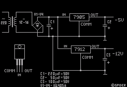 (С) Without Denomination Group'98 Доброго вам здравия, уважаемые поклонни- ки гениального творения Сэра Синклера! C вами снова "Without Denomination Group", и всё тот же Мг. POWer. Хоть "ВЕЛИКИЙ И УЖАСНЫЙ" :) и советовал мне быть достаточно кратким под страхом "проклятия вечного апгрейда", я всё-таки сделаю небольшое лирическое отступление. Очень радует тот факт, что помимо напи- сания в последнее время высококлассного софта, подключение Hayes-совместимого мо- дема дало Спекки как бы второе дыхание, вторую жизнь. Отпала та острая необходи- мость приобретения "писюка" лишь для полу- чения возможности выхода во внешний мир. А ведь очень большое количество спектрумис- тов покинуло Спекки именно из-за инфор- мационного вакуума, ощущения себя одиноким в своих планах, идеях, когда вокруг везде мелькают "голубые цапцуляторы" и нет почти ни одного единомышленника (особенно это ощутимо людьми, живущими в глубинке). И это действительно так. Человек не знает, что Спектрум живее всех живых! Он не спо- собен самореализоватся на своем любимом Спекки, поскольку отсутствует стимул для творчества по причине отсутствия людей, способных оценить его труд. Наличие модема и выход в сеть помогут некоторым образом решить эту проблему. Я уже не говорю о возможности всегда находиться в гуще собы- тий спектрумовской сцены, возможности оперативного получения самого свежего соф- та, обладание самой свежей информацией, возможности наиболее производительного написания совместных разработок (что ак- тивно использовалось нашей группой), да и просто общение с людьми твоих же интере- сов. Одним словом, мой вам совет: если у вас имеется телефон, не упускайте такой возможности и не мешкая подключайте к ва- шему Спекки модем - не пожалеете. Благо софт для этого уже написан и постоянно совершенствуется: S-Terminal, Melon, Zed, S-Tosser, Lara. Огромное спасибо всем ав- торам данных разработок! Мы же постараемся облегчить вам жизнь при подключении Hayes-совместимого модема, к созданию незабвенного Сэра Клайва Синклера. Данная разработка позволит вам, минуя покупку РСшного блока питания (цена которого является немаловажным ограничи- вающим фактором при принятии решения о подключении), с минимальными затратами вы- жать, помимо уже имеющихся +5 и +12V, столь необходимые модему -5 и -12V. Её достоинства - дешивизна, надёжность, и простота изготовления. Для этого вам при- дётся раскошелиться всего лишь на тран- сформатор, 4 диода (1 диодный мост), 3 конденсатора и 2 стабилизатора отрицатель- ных напряжений. (По ценам 97-го года мне сие удовольствие обошлось в сумму не более 30 тыс. в отличии 200-т за РСшный Б/П). Ну и, естественно, необходимы минимальные на- выки в обращении с паяльником. Следует также отметить, что данный девайс приме- няется _только_ как дополнительное устрой- ство к уже имеющемуся (как мы полагаем:) у вас блоку питания на +5 и +12V. Схема устройства приводится ниже.Все детали легко умещаются на плате размерами 100 X 50. Трансформатор, в прин- ципе, может быть любым с выходным напряже- нием от 12 до 16 вольт, к примеру ТВК-110- Л-2. Стабилизаторы отрицательных напряже- ний взяты импортные - 7905, 7912, но по- дойдут и их отечественные аналоги. При вы- соком нагреве последних, их необходимо ус- тановить на теплоотводящем радиаторе. Выпрямительный блок КЦЧO5А можно заменить на КЦЧO2Е, либо четырьмя диодами серий Д226, Д229, Д7, включив их по мостовой схеме. Конденса