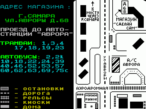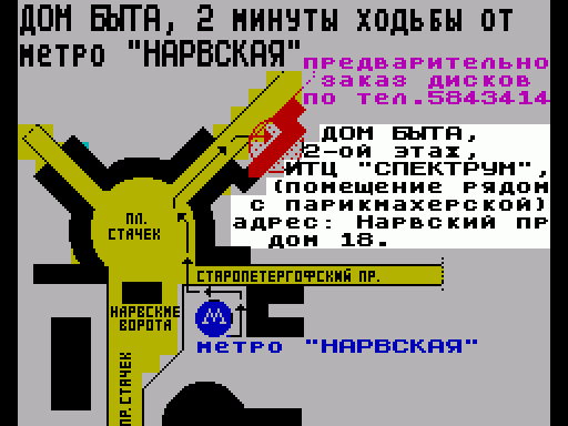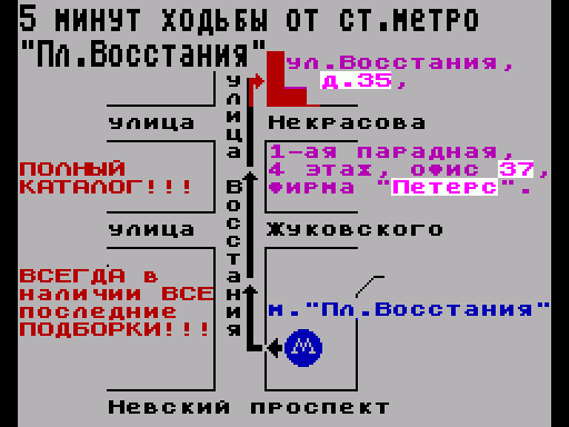 Р Е К Л A М A В Ж У Р Н A Л Е О Б Е Р О Н В С Ю Д О Р О Г У Б Ы Л A Б Е С П Л A T Н О Й! "СДЕЛАЙ САМ" ЕДИНСТВЕННЫЙ МАГАЗИН В САМАРЕ, ГДЕ МОЖНО КУПИТЬ СЕБЕ НЕМНОГО СПЕКТРУМА! Среди груды всевозможного рС'шного железа, свалки радиолюбительской литературы, вся- ческих радио- и телевизионных антенн,мик- росхем и печатных плат, паяльников и тес- теров, пиратских аудио- и CD-ROM'ов В Ы П Р И Б О Л Ь Ш О М Ж Е Л A Н И И сможете найти немного старого, доброго софта для SPECCY по каталогам MAGIC SOFT Магазин находится по адресу: г.Самара. ул.Авроры д.67Самарские пользователи ZX-SPECTRUM! Если вы конечно ещё есть в природе... :( Всё самое новое программное обеспечение для вашего любимого компьютера МОЖНО КУ- ПИТь в родном городе! Обращайтесь в мага- зин "Сделай Сам" или подходите на "Книжный Рынок" города Самары (территория "Ипподро- ма") по воскресеньям. В зной и холод на рынке вас ждёт Юдин Игорь и (возможно) да- же сам М.М.A! Тут мы непременно продадим вам всё то, о чём вы так давно мечтали!!! Для успешного нахождения нас на рынке сле- дует сразу после входа пойти по правому ряду, миновав лесок,где торгуют компактами для SONY PS, дойти до административного здания ипподрома и трибун. Тут ищите толпу хаккеров и дискеты 5.25 - это мы, спасите- ли вас от программного голода!!! Цены прошлогодние: от 6 руб. за диск! ZX SPECTRUM ON CD! Благодаря уникальной работе проделанной группой SPEED СО. и ALK/STAR OF KELADAN, каждый спектрумист страны может стать обладателем уникального компакт-диска с беспрецедентной коллекцией эмуляторов SPECTRUM'а и всевозможного ПО. Диск можно посмотреть на любом IBM РС совместимом компьютере с процессором не ниже DXЧ86. Короче, ваш гнилой "Пенёк" превратится в старый добрый Спектрум. Цена такого удо- вольствия $8 USD по курсу ММВБ на момент посылки перевода (а что делать, кому сей- час легко!). Кроме эмуляторов Спектрума и программ к ним, на диске записано ещё нес- колько эмуляторов,в частности:SEGA, DENDY, GAMEBOY, NINTENDO, SAM COUPE и даже AMIGA 600(+DEMOZ,+GAMEZ!) Мой адрес и телефон вы можете найти в раз- деле "От редакции". (C) М.М.A -===========***** WELCOME *****==========- Наша фирма предлагает со складов в СПБ программное обеспечение для ZX-SPECTRUM 48/128/256К ВЫ сможете выбрать дискеты из цветного с пояснениями каталога, включающего в себя более 3000 системных, игровых и авторских программ, расположенных более чем на 400 дисках. Здесь же Вы найдёте новейшие пос- тупления игровых программ, в том числе из Интернета. Подборки можно заказать и по телефону 584-34-14, Евгений Для желающих приобретать диски по почте мы можем предложить следующий вариант: при получении вашего заказа мы высылаем нало- женным платежом бандероль. Оплата произво- диться на почте. Почтовые расходы оплачи- вает покупатель. Стоимость 1 диска = 1 у.е., то бишь $. Возможна запись на диски 3.5 дюйма. Наш почтовый адрес: Санкт-Петербург, 193318, а/я 11. Находясь в Санкт-Петербурге, вы можете по- сетить наши торговые точки, расположенные по следующим адресам: (см. план-схему) -===========***** WELCOME *****==========-