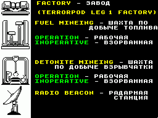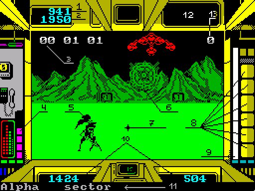 1) УКАЗАтЕЛЬ тОПЛИВА. Топливо тратится при любом движении ваше- го скиммера. Если вы находитесь в режиме карты, то даже незначительное движение скиммера приведет к большому расходу топ- лива. Для дозаправки наведите курсор на шахту по добыче топлива и нажмите "В". WARRNING: Если вас угораздит потратить все топливо, ваш скиммер перестанет передви- гаться и GAME OVER будет неизбежен! 2) УКАЗАтЕЛЬ ВЗРЫВЧАтКИ. Взрывчатка нужна для уничтожения "террор- подов". Пополнить запасы взрывчатки можно на шахтах по ее добыче таким же образом как и в случае с топливом. Помните, что шахты не могут хранить все добытое топливо или взрывчатку. На одной шахте может храниться максимум 500 единиц топлива или 1000 единиц взрывчатки. После достижения этого предела шахта останавли- вается. По этому стоит периодически произ- водить инспекцию всех шахт. 3) ЧАСЫ. Если у вас под руками нет часов, то это устройство напомнит вам сколько времени прошло от начала игры. Кстати, мой рекорд прохождения всей игры от начала и до конца - примерно два часа! 4) ЗАЩИтНЫЕ КАПСУЛЫ. У вашего скиммера есть 6 защитных капсул. Вы можете лишиться капсулы в двух случаях: если в вас попадет вражеская ракета или если кончится вся энергия. 5) "тЕРРОРПОД". Это ваш основной враг. 6) РАКЕтА. На горизонте постоянно висит вражеский корабль и пускает в вашу сторону ракеты с тепловым наведением. От ракеты можно увер- нуться или расстрелять ее лазером. Появле- ние ракеты в зоне видимости идентифициру- ется по характерному звуку, который начи- нает издавать ваш радар. 7) ОСНОВНОЙ ПРИЦЕЛ. Основной прицел всегда направлен на по- верхность астероида впереди вашего скимме- ра. В отличии от дополнительного прицела он неподвижен. Если основной прицел наве- ден на какой либо обьект, вы можете прочи- тать в окне сообщений информацию по этому обьекту. Каждый выстрел из лазера в режиме "земля-земля" попадает точно в ту точку на которую указывает этот прицел. 8) ЧАСтИ тЕЛА. Всего вам предстоит собрать 6 частей тела для создания "террорпода". T.е. 3 ноги, рука, туловище и голова. После сбора оче- редной части, загорается один из шести ин- дикаторов. 9) ЭНЕРГИЯ. Этот индикатор показывает уровень энергии защитного поля скиммера. Энергия тратится в случае если вражескому "террорподу" уда- лось подойти сзади и атаковать вас. Кроме того вы можете использовать энергию для защиты от ракет (клавиша SPACE). 10) КООРДИНАтЫ. Цифры в этих колонках являются условными координатами по X и Y. Запомнив (или запи- сав) координаты точки, вы можете легко найти ее потом, даже если была нажата кла- виша "Z". 11) СООБЩЕНИЕ. В это окно выводится сообщение об обьекте на который наведен основной курсор. Если обьекта нет - выводится название сектора. 12) РАДАР. На радаре отображаются все обьекты того участка сектора где вы находитесь. Но если "террорподы" успели разрушить на этом участке радарную станцию, радар будет мол- чать до тех пор, пока вы эту станцию не восстановите. 13) НАБРАННЫЕ ОЧКИ. 3а каждую сбитую ракету вам начисляют 100 очков. Все набранные очки отображаются на этом индикаторе. Для усвоения материала, рассмотрим при- мер боевых действий. Вы высаживаетесь в Alfa sector, быстро нажимаете клавишу "M" и перед вами появля- ется карта. Заметив ближайшего к вам "тер- рорпода", не делая резких движений (топли- во не резиновое!), вы наводите курсор на этого стального монстра, повторно нажимае