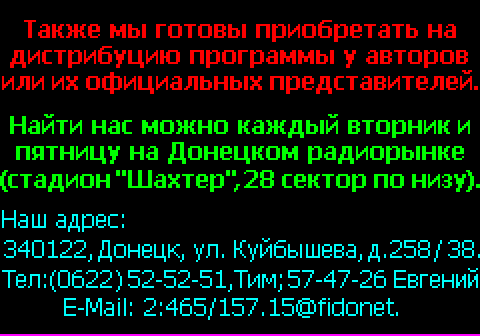 Продажа , покупка и обмен нового прог- раммного обеспечения.Жители Одессы могут зайти на Одесский радиорынок и преобрес- ти самые новые программы. г.Одесса 270117 ул. Заболотного дом 20 кв. 198 Истратов Алексей Иванович ТЕЛЕфОН: 8(0482)560922 ________________________________________![]()