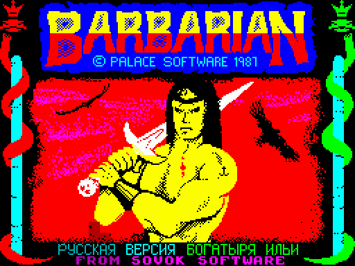 ). Итак, вы очутились в какой-то горной долине. Прежде всего со- ветуем вам научиться хорошо ори- ентироваться на местности (дви- гаться влево и вправо). В случае игры с компьютером вы управляете варваром с повязкой на голове. Сила играющего выражается в виде красных кружков в верхних углах экрана. Когда один из игроков пропускает удар, часть энергии поeдаeтся змeёй. Игра ведётся до полной победы. Проигравшего уно- сит с поля боя гоблин. В ходе боя действуют следующие комбинации клавиш: ВВЕРХ -прыжок; ВВЕРХОГОНЬ -удар в голову ВВЕРХВПРАВО -блок мечом; ВВЕРХВПРАВООГОНЬ-удар головой; ВНИЗ -присесть; ВНИЗОГОНЬ -удар по ногам ВНИЗВЛЕВО -подкат назад; ВНИЗВЛЕВООГОНЬ -удар сверху; ВПРАВО -движение; ВПРАВООГОНЬ -удар в живот; ВПРАВОВНИЗ -подкат вперёд ВПРАВОВНИЗОГОНЬ -удар ногой; ВЛЕВО -движение; ВЛЕВООГОНЬ -удар по шее; ВЛЕВОВВЕРХ -блок мечом; ВЛЕВОВВЕРХОГОНЬ -"восьмёрка". Игра вдовём несколько отлича- ется от игры с компьютером. Если противники долгое время не могут друг друга одолеть, компьютер меняет картинку. После этого си- лы обоих играющих восстанавлива- ются, а очки остаются прежними. Победив компьютер на одном уровне, вы переходите на следую- щий (всего их восемь). C каждым уровнем противник становится всё сильнее и сильнее, и вам очень непросто будет его одолеть. Всё-таки попытаться следует, же- лаю удачи !
