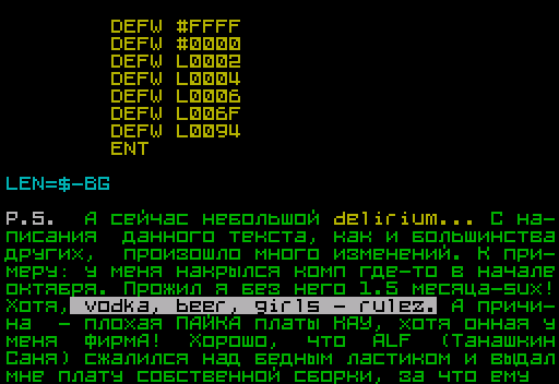 DEFW #0000 DEFW L0002 DEFW L0004 DEFW L0006 DEFW L006F DEFW L0094 ENT LEN=$-BG Р.S. А сейчас небольшой delirium... C на- писания данного текста, как и большинства других, произошло много изменений. К при- меру: у меня накрылся комп где-то в начале октября. Прожил я без него 1.5 месяца-sux! Хотя, vodka, beer, girls - rulez. А причи- на - плохая ПАЙКА платы KAY, хотя онная у меня фирмА! Хорошо, что ALF (Танашкин Саня) сжалился над бедным ластиком и выдал мне плату собственной сборки, за что ему BIG THANX.
