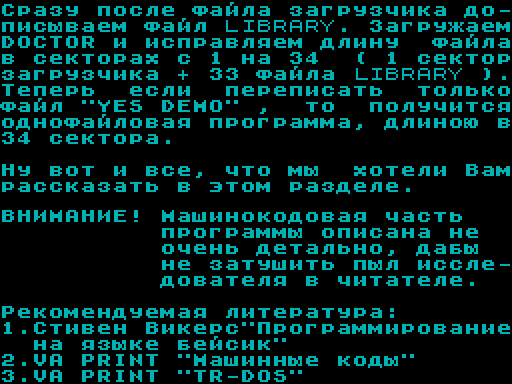 ОБМЕН ОПЫТОМ. В этом разделе будет расска- зано о создании демонстрационной программы YES DEMO. Мы разберем всю программу : от бейсиковских вспомогательных процедур до загрузчика. Но перед изучением нижеизложенного мате- риала, запустите эту программу и внимательно изучите ее в работе. ВНИМАНИЕ!!! Для понимания мате- риала, читатель должен обладать некоторыми знаниями. Изготовление любой программы начинается с планирования экрана На экране , по возможности , не должно быть пустого места.Pacno- ложение всех элементов заставки должны подчиняться определенным правилам (это в частности связа- но с неудобной организацией области атрибутики). Например , рамка, так же как и рисунок в центре, находятся строго в зна- коместах. Следует отметить и то, что движушиеся элементы програм- мы (индикаторы, бегушая строка, летаюшая "YES") не накладываются друг на друга, так как это не предусмотренно. Заставка была нарисована в ART STUDIO. Файл в формате A.S. имеет имя SCREEN. Для уменьшения объема памяти, занимаемой заста- вкой, она была скомпрессирована и имеет имя SCREEN+ . Длина файла SCREEN+ равна 1562 байта, притом, что файл SCREEN имеет длину 6912 байт. Знакогенератор (шрифт) был также нарисован в ART STUDIO. Длина знакогенератора - 768 байт 96 знаков по восемь байт каждый Этот файл имеет имя ABC.fnt. Теперь переходим к рассмотреню бейсик блока BASIC. Так как адресация экранной области ZX-SPECTRUM не очень удобна и программа тратила бы много времени на пересчет координат, то создается таблица адресов для второй трети экрана. Эту таблицу создают 100 - 110 строки программы BASIC (во время выполнения этих строк, программа показывает, какие адреса занося- тся в таблицу). Таблица содержит 64 двухбайтных адреса и,следова- тельно, имеет длину 128 байт. Имя файла таблицы - TABL 01$ . Теперь немного о летаюшем YES (в дальнейшем спрайт). Положение спрайта на экране (по горизо- нтали) заранее предугадать нево- зможно, и поэтому он был нарисо- ван (опять же в ART STUDIO, файл SPRITE) во всех восьми возможных Каждый спрайт имеет размер 2 на 5 знакоммест и длину 80 байт. После каждого спрайта идет егонетронутой. Маска как бы выреза- ет место под спрайт. Этот прием, кстати, используется во всех игровых программах. И опять же, все восемь спрайтов и масок неудобно расположены для применения, поэтому при помоши строк 10-40 программы BASIC все это было переведено в другой фо- рмат,записано под именем SPRITE+ Спрайт перемешается по трае- ктории эллипса.Каждый раз высчи- тывать следуюшую координату траектории требовало бы много машинного времени, поэтому стро- ки 200-210 все той же программы BASIC, создают таблицу координат траектории. В рассмотренной про- грамме таблица координат соде- ржит 101 координату , заданную в системе Х,Y. Таким образом та- блица занимает 202 байта.Призна- ком окончания таблицы являются два нуля . Окончательная длина таблицы - 204 байта, имя ELIPS. Для написания текста были использованы З00-З80 строки про- граммы BASIC. В конце текста стоит нуль - признак окончания. Все сообшение имеет длину 516 байт и имя TEXT. Музыка была на- писана в редакторе SOUND TRACKER Длина мелодии - ЗЗЗб байт, адрес размешения - З4458, имя - MUSIC. Переходим к рассмотрению ко- довой части программы.Если у Вас фирменная версия журнала , то к диску прилагалась распечатка ассемблера демонстрации. Написание программы начиналось с изготовления отдельных подпро- грамм (в дальнейшем п/п). Каждую в отдельности