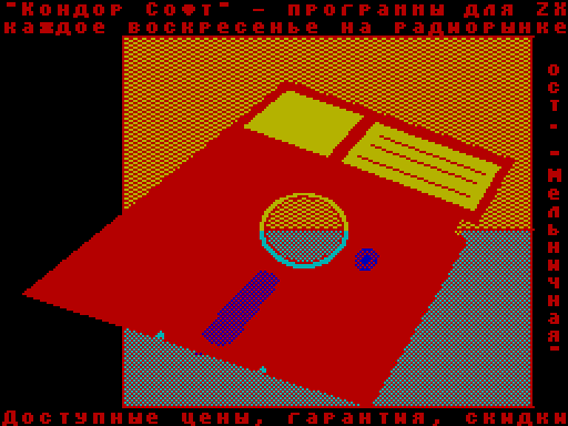"КОНДОР СОФТ" (Ярославль): 1.Самый широкий выбор программного обес- печения для "ZX-Spectrum"! 2.Доступные цены! 3.Сервис! 4.Бесплатная гарантия на ВСЕ проданные дискеты с программами (при условии со- хранения у дискет товарного вида). 5.Постоянным покупателям - скидки! 6.Оптовикам (от 10 дискет) - скидки тоже! 7.Высокое качество записи (дискеты запи- сываю ТОЛЬКО на японской аппаратуре!). 8.ВСЕГДА в продаже чистые дискеты веду- щих фирм мира (BASF, VERBATIM, MAXELL, SONY, CLAME, XEROX, BOEDER, SIGMA...). 9.А также, различная компьютерная 'мело- чь': защитные экраны, диск-боксы, го- ловки для принтеров, мыши... КАЖДОЕ ВОСКРЕСЕНЬЕ на Ярославском радио- рынке (ост. Мельничная, автобус N "4"), с 8:00 до 12:00. Приходите, выберайте! ИЛИ по телефону: (0852) 35-13-02 (Алексей) D.J. MusicSoft (Ярославль): Пока я набивал рекламу, мне позвонил D.J. и сказал: Что, если кому-то нужны музоны под заказ, то он их может написать за не- большое денежное вознаграждение. От Вас лишь нужна кассета с оригиналом! Адрес: 150061, Ярославль, Брагино, Архангельский проезд, д.12, кв.3, код под'езда: 147 Гусейнов Дмитрий Владимирович. ИЛИ в воскресенье на Ярославском радиорынке, фирма "Condor Soft". O качестве его музонов можете судит по журналу "ElDorado" (все музоны его!), а в ближайшее время выйдет крутейшая музыкал- ка "10 хитов MTV" (написанная им и Omehom) приобрести которую можно будет ТОЛЬКО у меня! Вот там будут музоны!!! Ждите!