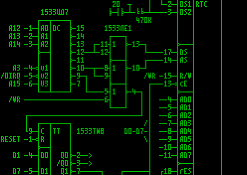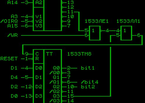 Здесь последний элемент ЛЛ1 надо заме- нить на элемент 1SSЛЛ2 и резистор на 1К (у ЛЛ2 выход - открытый коллектор), и соединить его выход с одноименным выходом схемы, показаной на рис.1. Или можно тут применить элемент ЛП8, как в Пентагоне. а 13-ую и 10-ую ноги КП11 (рис.1) надо по- давать сигнал с 6-ой ноги ТМ2, на 1-ую ногу ЛЛ2 (рис.1) - подавать с 3-ей ноги ЛЛ1. Вместо серии 1533 можно поставить 555. Можно, конечно, поставить тумблера на 1- ую и 15-ую ноги КП11 и работать руками, но лучше сделать так: bit1 и /bitЧ - это биты порта #CFF7, получены вот таким образом:![]()
