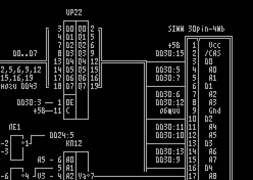 Simm 4Mb на компьютере Sintez 2 (С) Pantera _________________________________________ Привет всем, вот опять я решил показать всем мою новую примочку. Да, это ни что иное, как схема подключения simm`а на 4Mb к компьютеру Sintez.Ну не знаю,может быть кому-нибудь пригодится.Даже не могу пред- ставить,кому понадобится в IS-DOS`е элек- тронный диск размером в 15000 блоков ;-). Схема приводится для компьютера Sintez. Это тот, который раньше был 48к.Но теперь мой монстр хавает 1 метровые simm`ы.А вот теперь может и 4 мега захавать без напря- га. Следовательно, все сигналы приводятся для схемы Sintez`а. Я думаю, что не нужно много ума, чтобы переделать ее под любой другой комп. Например метровую схему для Ленинграда я переделывал под Sintez и все О.К О.В У кого комп уже доделан до одного метра по порту #DFFD mask #07,то вам понадобит- ся всего лишь 1-а КП12, 1-а ТМ8, 1-а ЛЕ1. В данной доработке используются 3й и 4й биты #DFFD. Но так как в Профи 4-й бит используется СР/М, то значит владельцам этих компьютеров можно дальше не читать. Для того чтобы воспользоваться верхней памятью, необходимо работа ТОЛьКО по пор- ту #DFFD. В режиме #7FFD можно работать ТОЛьКО с одним мегабайтом. Мегабайт реализуется по биту защелки, т.е. бит 5 #7FFD. Этот мег юзается в Тыр Досе 5.1ЗFm ( м- это значит Ram диск на один мег ( 3568 секторов). В досе 5.13 это диск D:. А виртуальный диск работает нааммнноггоо быстрее флопа. Все проги использующие об- ращение к флопу через #3D13 - летают. Управление памятью осуществляется так: #DFFD mask #1F #7FFD mask #Е7 Схема поделена на две части, т.к. она не вместилась в один экран, а жаль ;-).-----------------------------------------![]()
