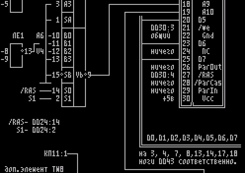 Теперь при сбросе бита2 порта #EFF7 в нуль память выше 128 будет открываться и 48-я защелка - блокироваться.А при уста- новке его в единицу будет закрыт доступ к памяти выше 128К и 48-й защелкой можно пользоваться. Если в компе есть CMOS-часы, а также прошивка Мг.Gluk Reset Service 5.3k,то в ней поддержан этот стандарт блокиров- ки памяти. У меня стоит именно эта про- шивка и CMOS-часы, и я просто тащусь от всего этого кайфа !!! Регенерация simm`а 4Mb Для тех товарищей, у которых уже стоит доработка Sintez`а до 512к, (но только с регенерацией дополнительного адреса РУ7, т.к. практика показывает, что можно не производить регенерацию по первой ноге РУ7) можно дальше читать не все, ну а мо- жет быть и все ;-). Старые сигналы куда идут новые-отрезать. Для тех у кого все еще 128к сделайте пра- вильную регенерацию simm`а таким образом: с DD23:5 подать на DD26:10 с DD23:3 подать на DD26:12 на DD23:5 подать с КП11:12(дораб.до 128) на DD23:3 подать землю на DD23:11 подать с КП11:4(дораб.до 128к) на DD23:13 подать +5в на DD24:5 подать с ЛЕ1:1(смотри по схеме) на DD24:3 подать землю на DD24:11 подать с ЛЕ1:13(см. по схеме) на DD24:13 подать землю * от КП11:9:12 (доработка до 128к) убрать убрать сопротивления. Сигналы регенерации видеоконтроллера, (А5 V3, A6 V4, A7 V5) перед подачей на мультиплексоры платы расширения, необходимо отрезать от мультиплексоров платы компьютера (!!!). НЕ ОШИБИТЕСЬ С ПЕРЕПАЙКОЙ СИГ= НАЛОВ ВИДЕОКОНТРОЛЛЕРА. У МЕНЯ ВСЕ РАБОТАЕТ И ПО СЕЙ ДЕНЬ ПОЭТОМУ FUCK`u НЕ ПРИНИМАЮТСЯ!! Необходимо еще сделать такую доработку:![]()