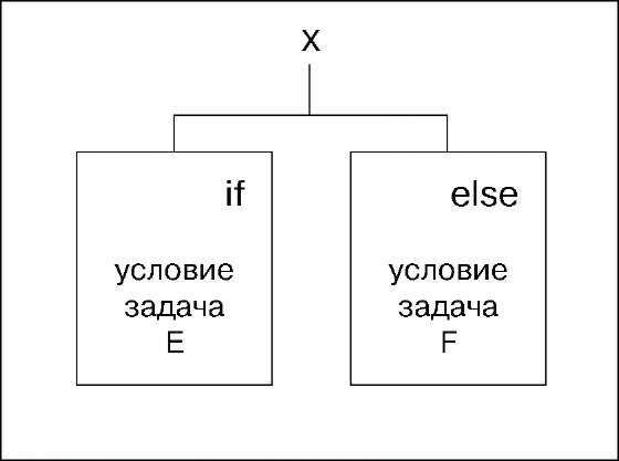 Здесь представлено условие IF, что делать, если оно выполняется (задача E) и что делать в ином случае - ELSE (задача F).