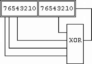 Чтобы "перексорить" эти биты, достаточно "вращать" аккумулятор влево командой RLCA (в сторону возрастания номеров битов), выполняя команду XOR в нужный момент (один раз с регистром L и три раза с регистром H). Неважно, что портятся остальные биты аккумулятора, ведь нас интересует только один. Последней командой RLCA нужный нам бит попадает в флаг переноса и затем командой ADC HL,HL попадет в нулевой бит регистровой пары HL после ее сдвига влево.