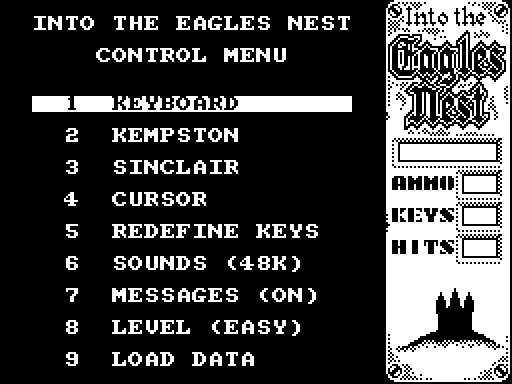 Меню - это что-то вроде диспетчерского пункта, из которого можно вызвать любой кадр заставки. Обычно в меню выбирается способ управления игрой: один из типов джойстика (Kempston, Sinclair и т. д.) или клавиатура (Keyboard); начальный уровень (Level); запуск игры (Start Game). После выбора управления от клавиатуры часто появляется еще один кадр - Define Keys, в котором предлагается назначить удобные именно для вас управляющие клавиши. В ряде игр как отдельные кадры заставки выводится таблица рекордов (Hi Score), подсказка (Help), рассказ о сюжете (History) и прочая информация.
